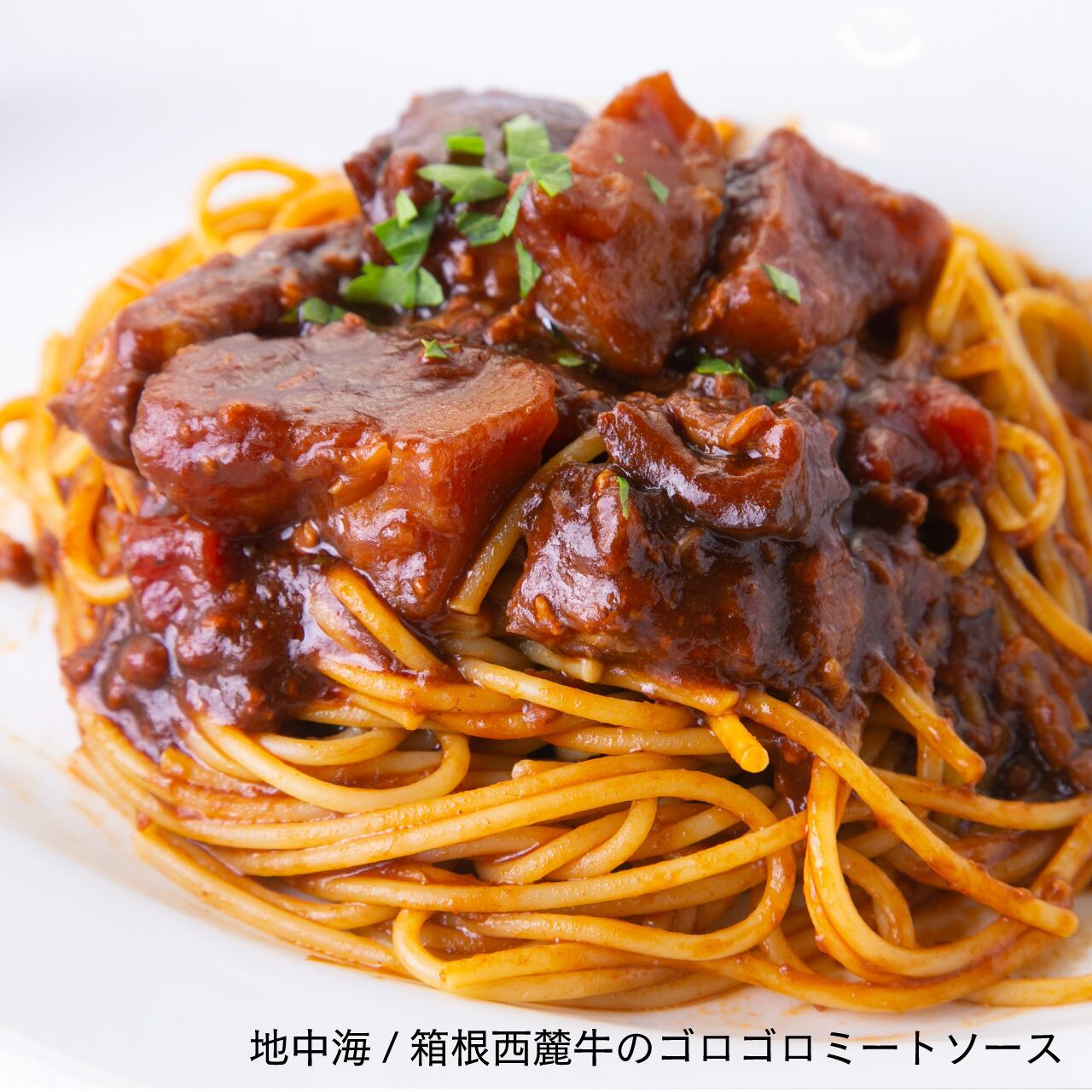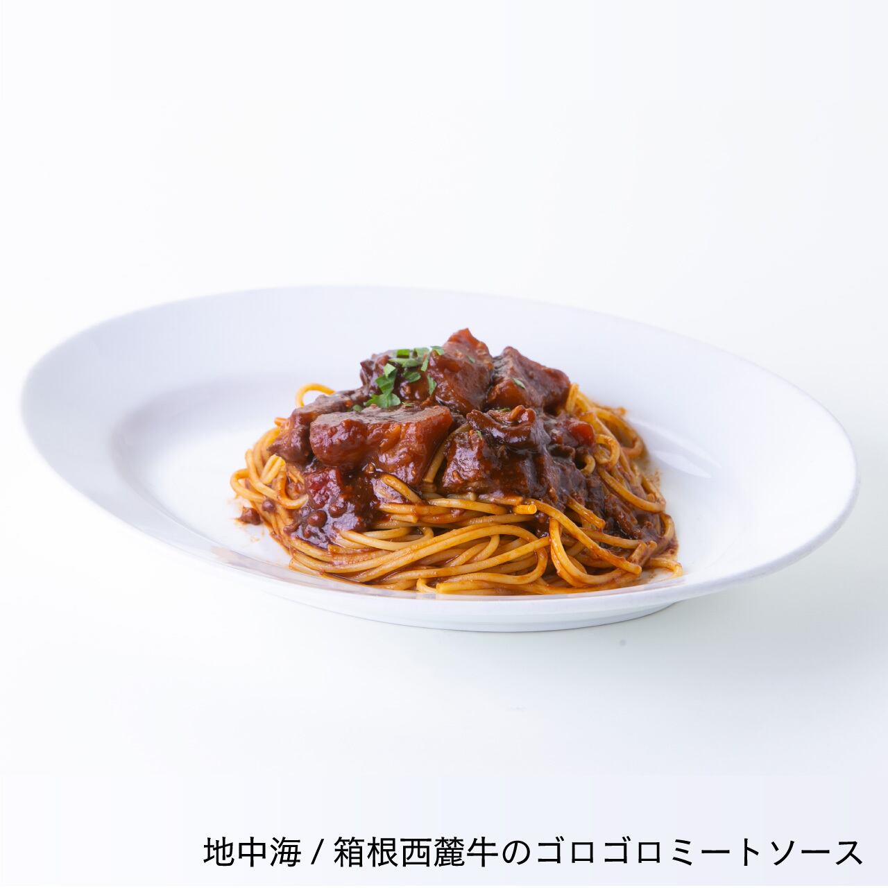 箱根西麓牛100%のミンチをトマトと香味野菜、たっぷりの赤ワインで煮込んだ芳醇な美味しさのミートソースです。
